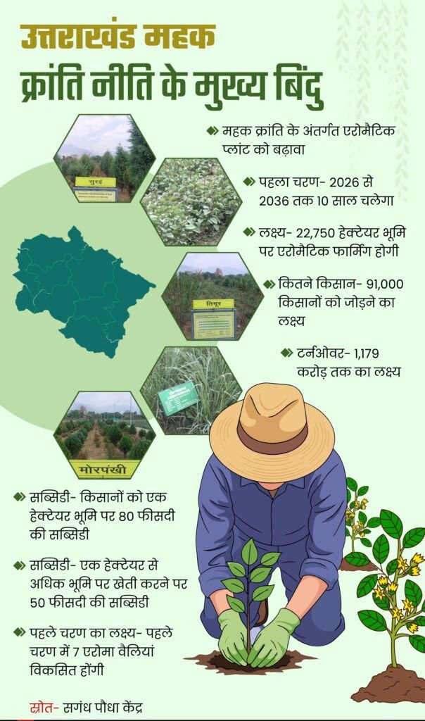 उत्तराखंड महक क्रांति नीति के मुख्य बिंदु: उत्तराखंड महक क्रांति नीति के पहले चरण में अगले 10 सालों यानी 2026 से 2036 तक ये योजना चलेगी. प्रदेश भर में 22,750 हेक्टेयर भूमि पर एरोमैटिक फार्मिंग का लक्ष्य रखा गया है. इस नीति के जरिए 91,000 किसानों को जोड़ने का लक्ष्य रखा गया है.
