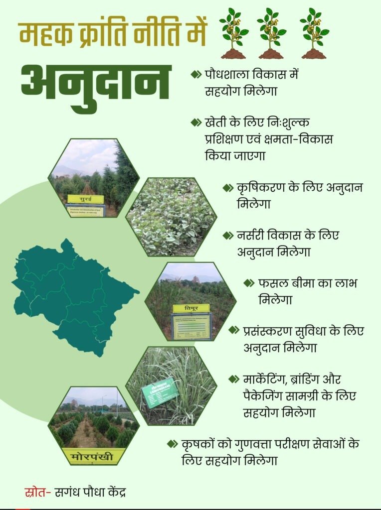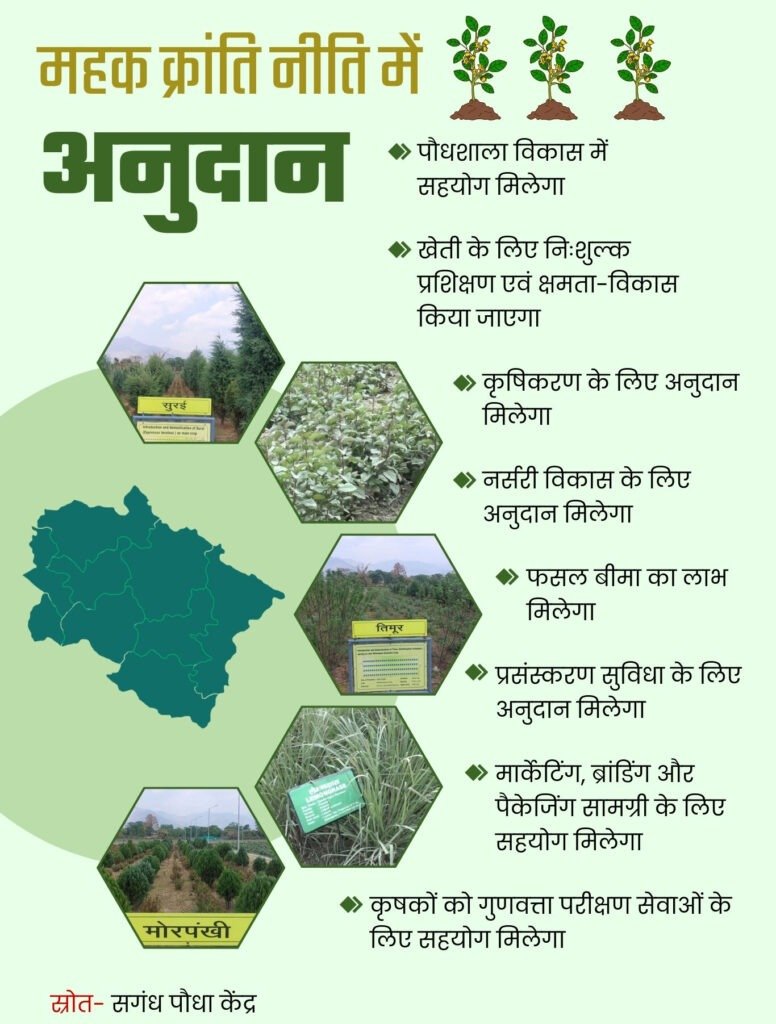 महक क्रांति नीति के तहत मिलेगा अनुदान: उत्तराखंड महक क्रांति नीति के तहत पौधशाला विकास में विभाग द्वारा सहयोग दिया जाएगा. खेती के लिए निःशुल्क प्रशिक्षण एवं क्षमता-विकास किया जाएगा. इसके साथ ही कृषिकरण के लिए भी अनुदान दिया जाएगा. किसानों को नर्सरी विकास के लिए अनुदान मिलेगा. उत्तराखंड वन्य जीव और प्राकृतिक आपदा से फसलों को नुकसान पहुंचता है. इसलिए फसल बीमा का भी लाभ मिलेगा. प्रसंस्करण (Processing) सुविधा के लिए अनुदान दिया जाएगा. मार्केटिंग, ब्रांडिंग और पैकेजिंग सामग्री के लिए भी संगध पौधा केंद्र से सहयोग मिलेगा. कृषकों को गुणवत्ता परीक्षण सेवाओं के लिए सहयोग मिलेगा.
